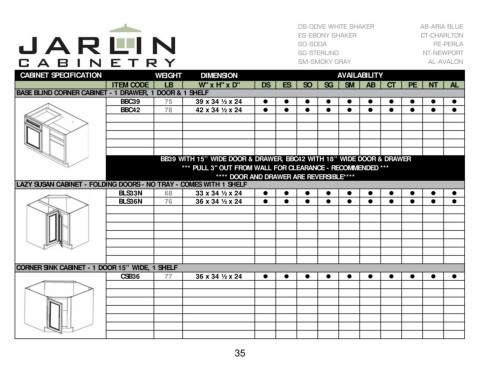 ITEM CODE BASE BLIND CORNER CABINET - 1 DRAWER, 1 DOOR & 1 SHELF  BBC39  BBC42  LAZY SUSAN CABINET - FOLDING DOORS - NO TRAY - COMES WITH 1 SHELF   BLS33N  BLS36N  CORNER SINK CABINET - 1 DOOR 15” WIDE, 1 SHELF  CSB36