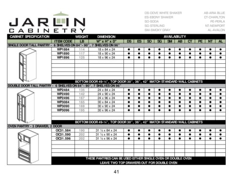 ITEM CODE SINGLE DOOR TALL PANTRY - 6 SHELVES ON 84”- 90”, 7 SHELVES ON 96” WP1884 WP1890 WP1896 DOUBLE DOOR TALL PANTRY - 6 SHELVES ON 84”- 90”, 7 SHELVES ON 96” WP2484 WP2490 WP2496 WP3084 WP3090 WP3096 OC31.584 OC31.590 OC31.596