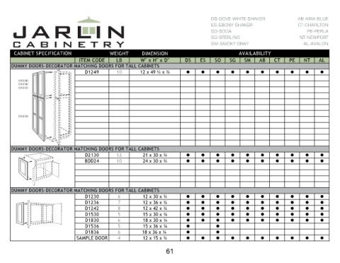 ITEM CODE DUMMY DOORS-DECORATOR MATCHING DOORS FOR TALL CABINETS  D1249  DUMMY DOORS-DECORATOR MATCHING DOORS FOR TALL CABINETS  D2130  BDD24  DUMMY DOORS-DECORATOR MATCHING DOORS FOR TALL CABINETS  D1230  D1236  D1242  D1530  D1830  D1536  D1836  SAMPLE DOOR