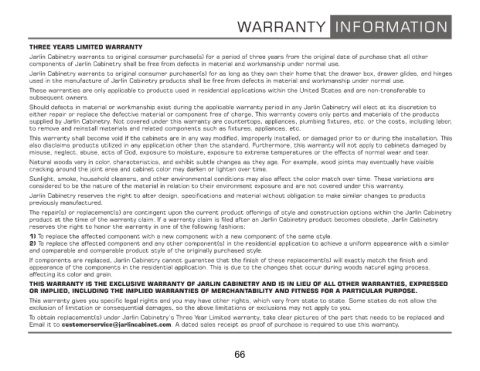 supplied by Jarlin Cabinetry. Not covered under this warranty are countertops, appliances, plumbing xtures, etc. or the costs, including labor,